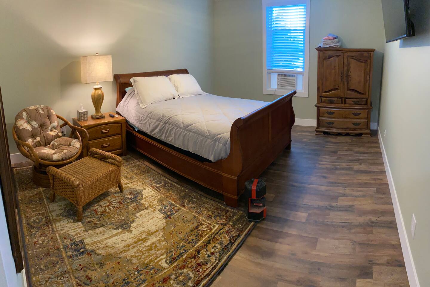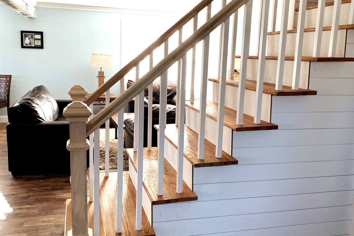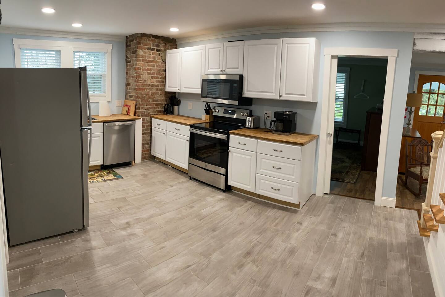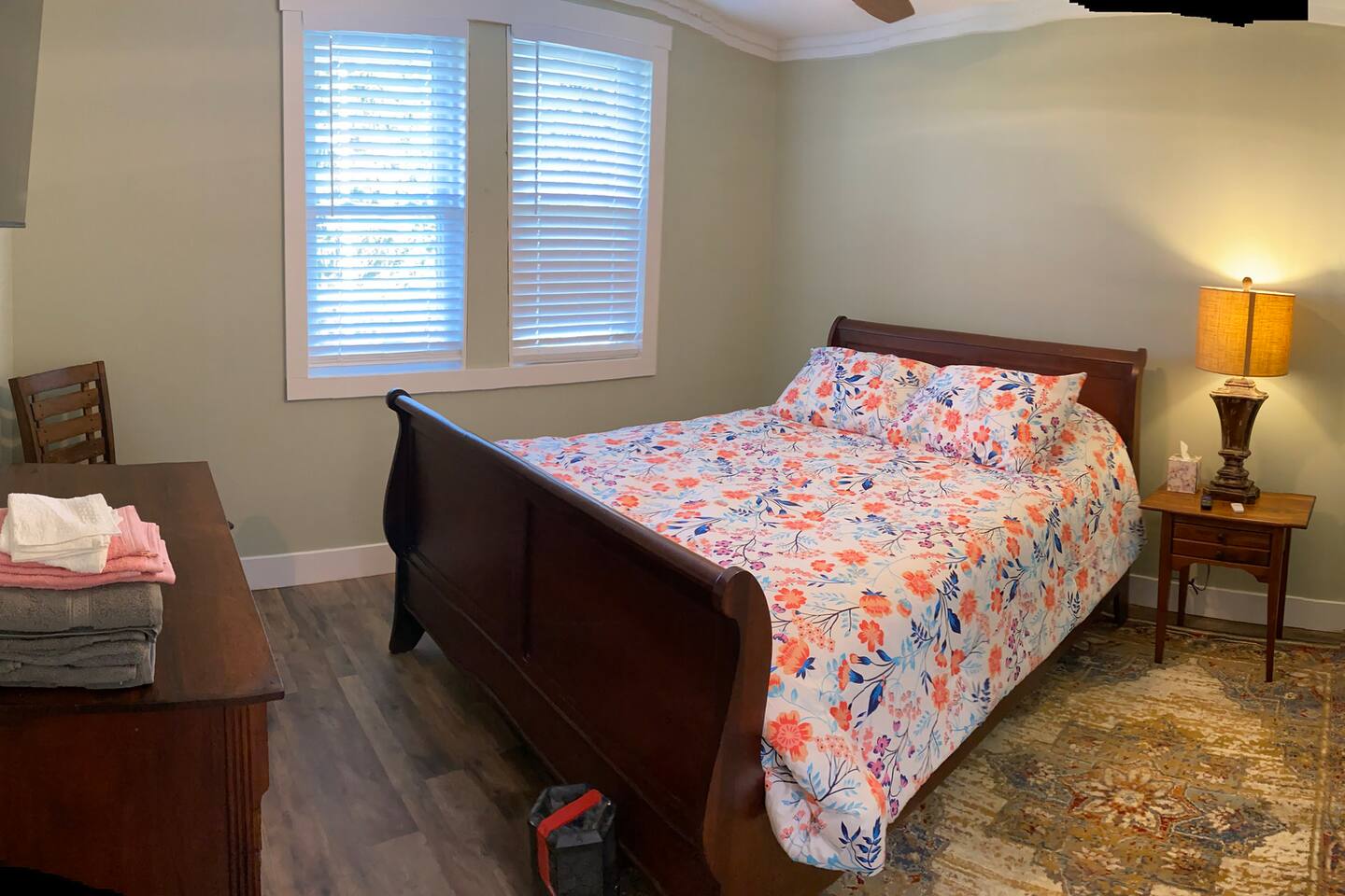 First floor has one queen bedroom and a full bathroom. No steps to enter the house from the back door. Second floor has 3 queen bedrooms, 1 king bedroom with a day bed and a full bathroom. The house is fully furnished so just bring your suitcase.
