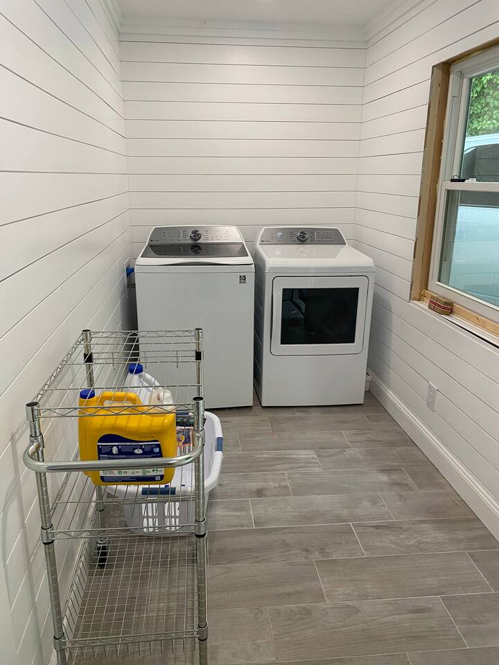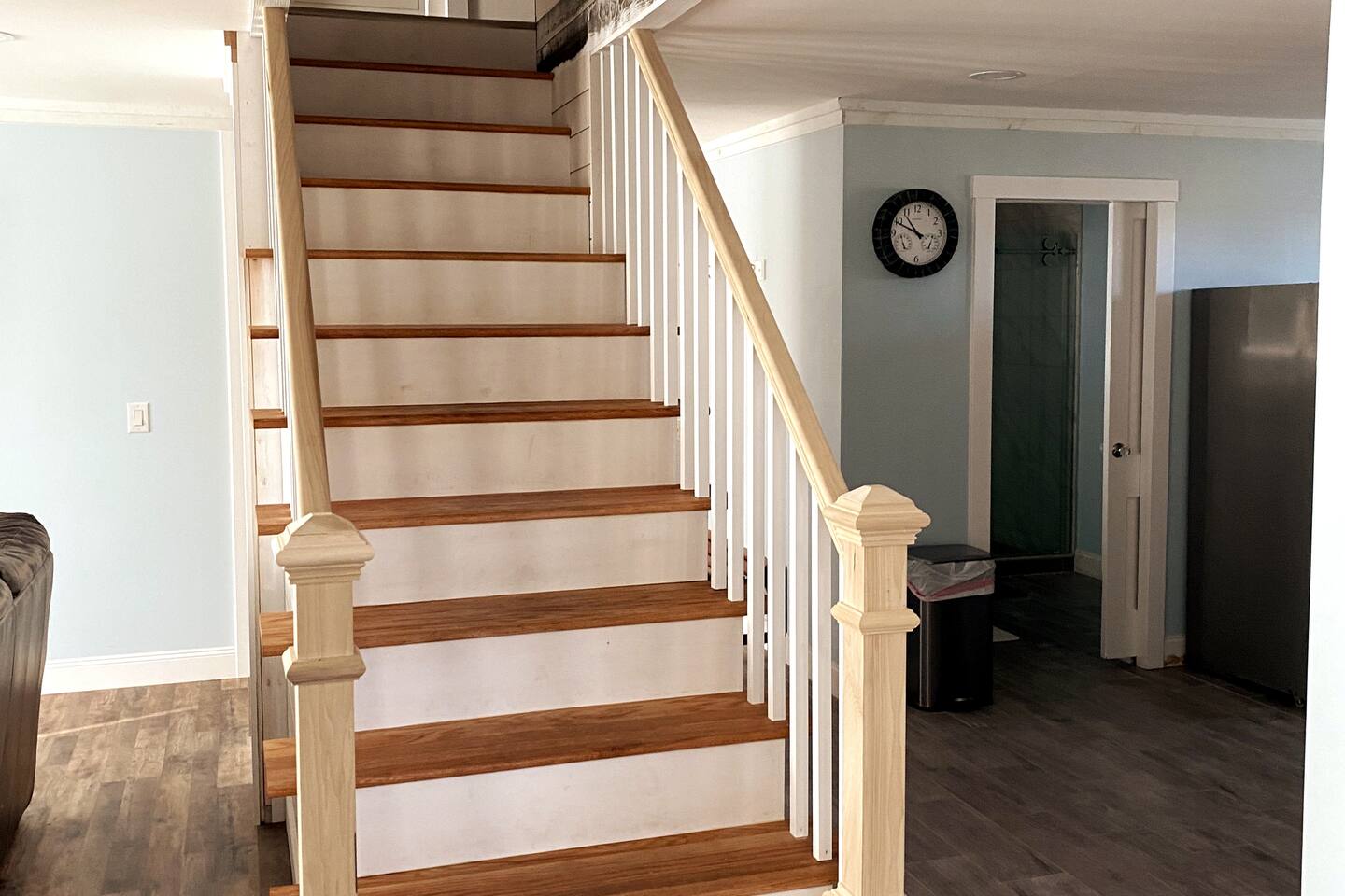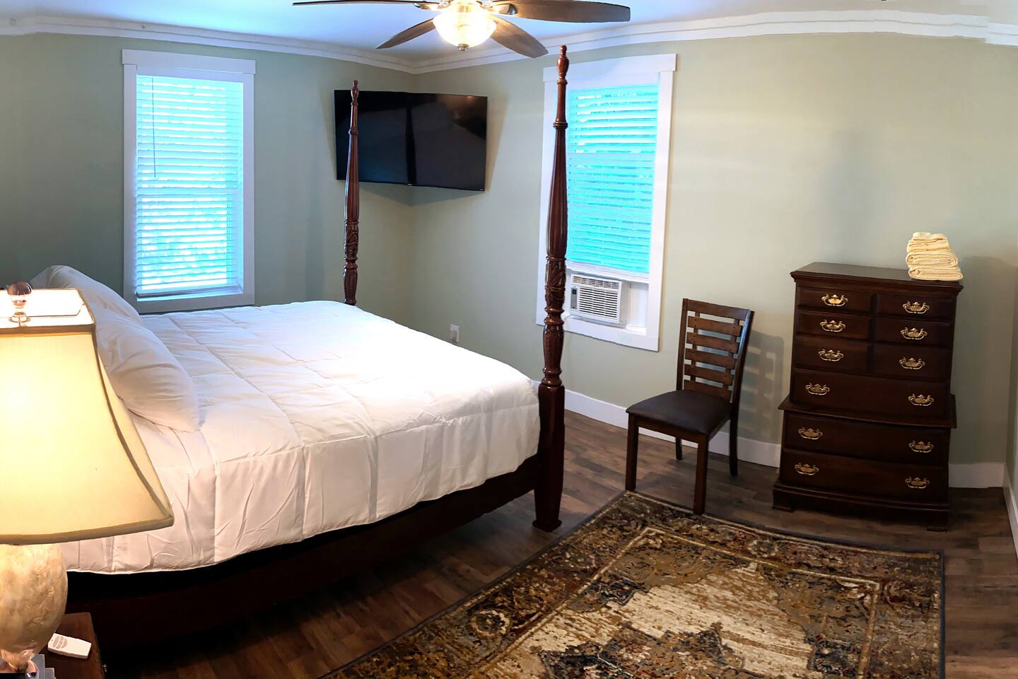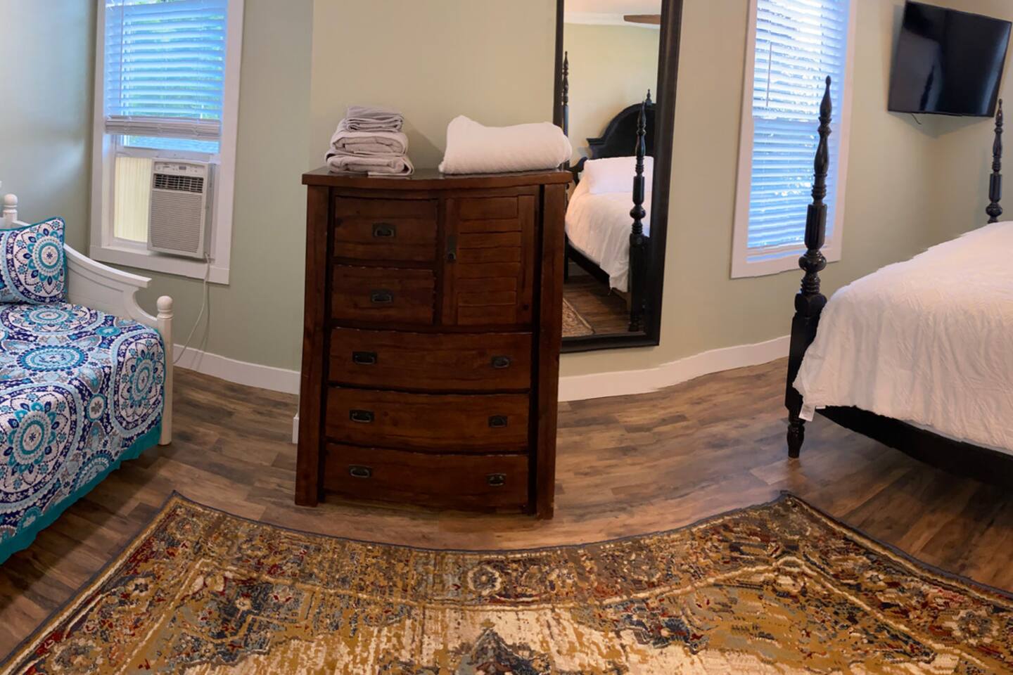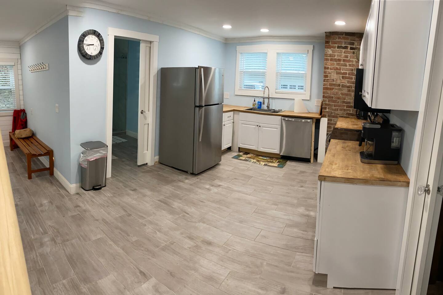 First floor has one queen bedroom and a full bathroom. No steps to enter the house from the back door. Second floor has 3 queen bedrooms, 1 king bedroom with a day bed and a full bathroom. The house is fully furnished so just bring your suitcase.