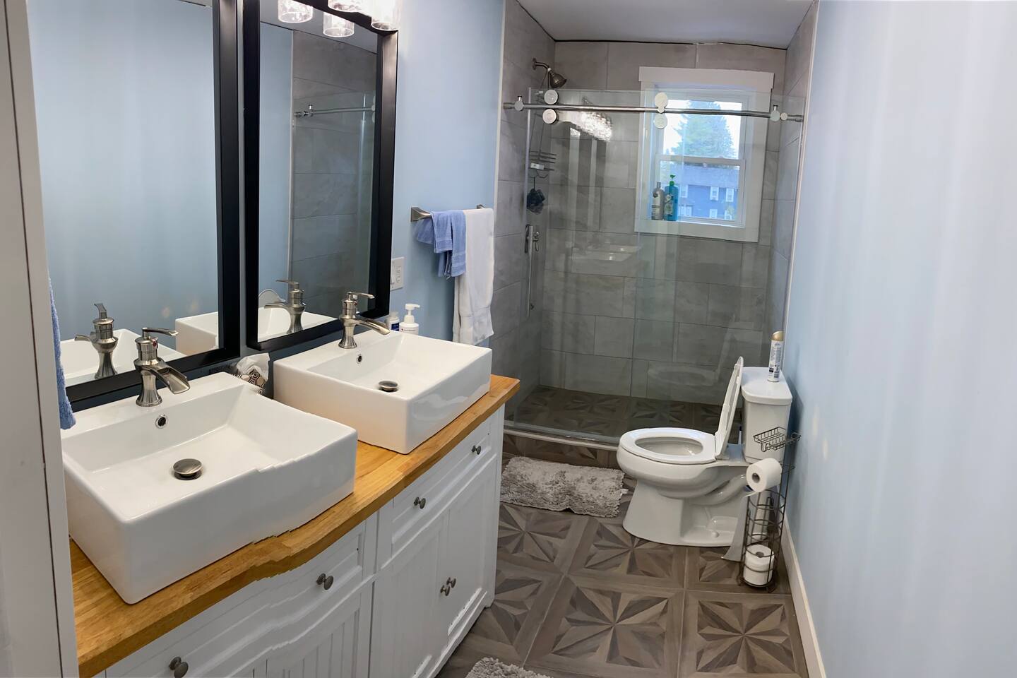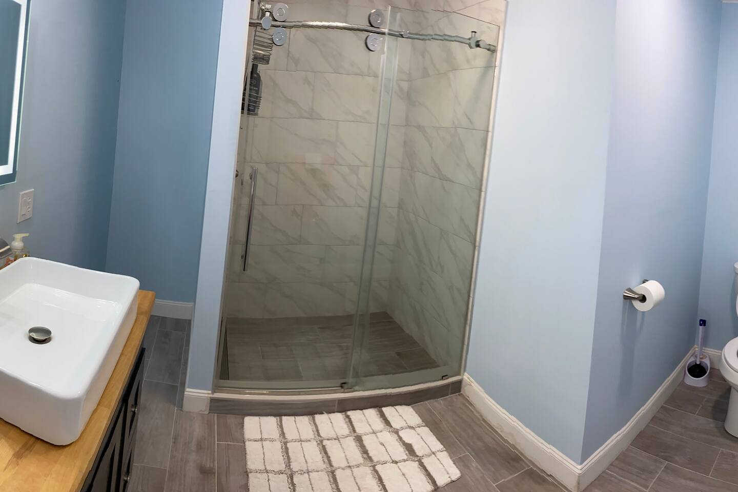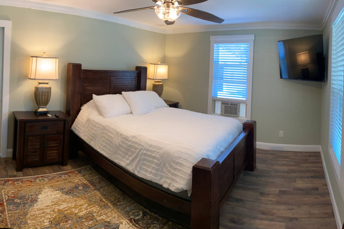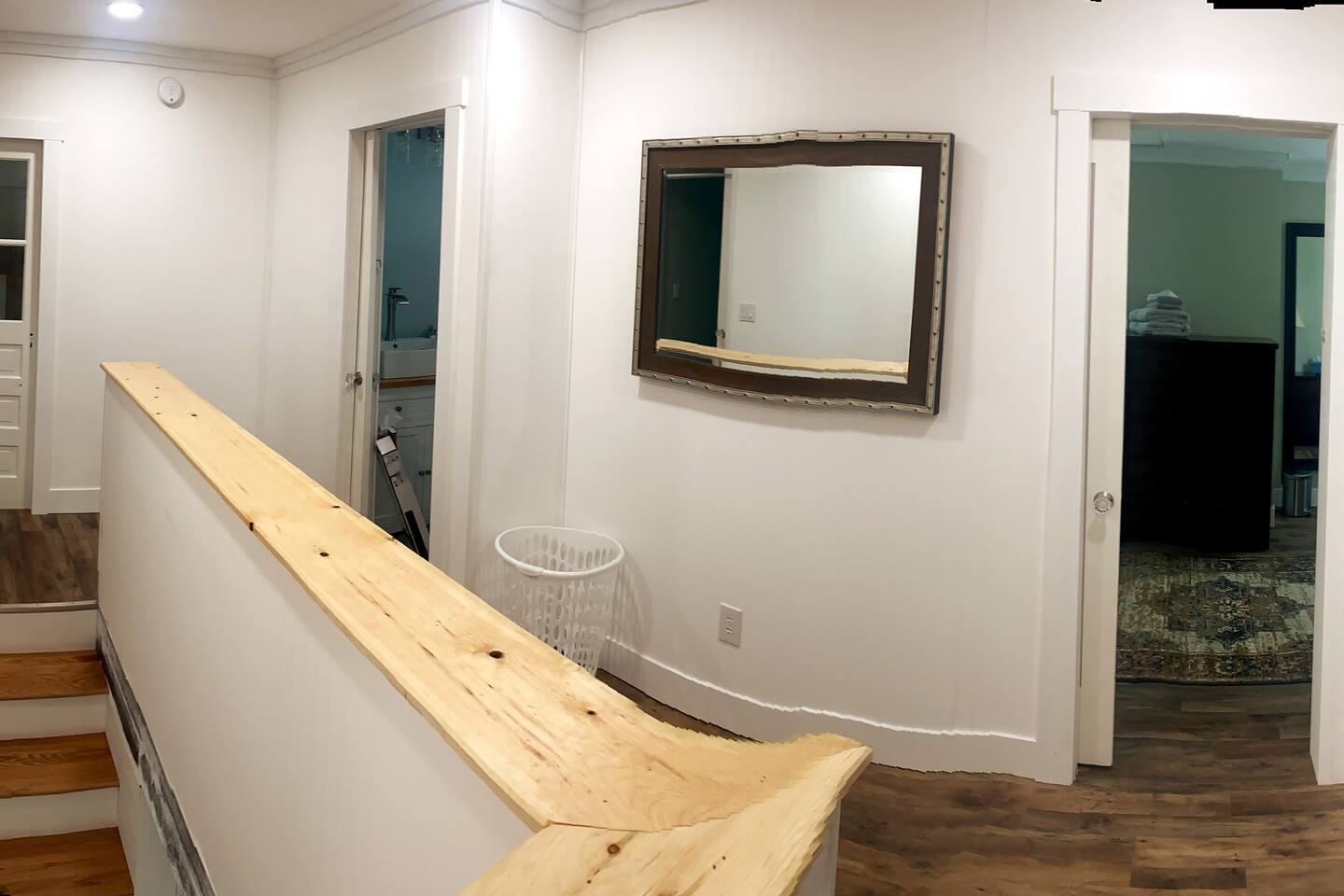 First floor has one queen bedroom and a full bathroom. No steps to enter the house from the back door. Second floor has 3 queen bedrooms, 1 king bedroom with a day bed and a full bathroom. The house is fully furnished so just bring your suitcase.